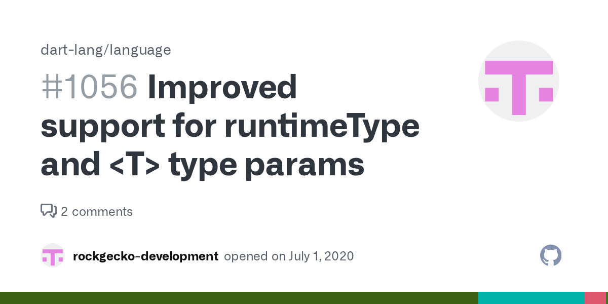The dart language is type safe:.. 19.11.2019 · dart objects have runtimetype property which returns type. Unlike is , it will only return true if compared to an exectly same type, which means comparing it with its super class will return false. Although types are mandatory, type annotations are optional because of type inference. Just to clarify a bit the difference between is and runtimetype. If (foo is foo) { print(it's a foo!); Todas las clases devueltas por runtimetype son de tipo _type, por lo que no se puede llamar ninguno de sus métodos. Unlike is , it will only return true if compared to an exectly same type, which means comparing it with its super class will return false.